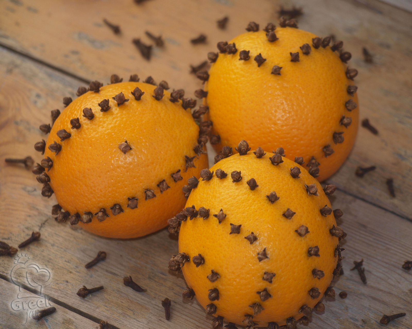 An old and very simple technique for scenting a room is the pomander. All we have to do is put cloves in oranges, either randomly or according to our own designs. We then place them on a pretty platter with some potpourri, or just in a bowl by themselves, and let the heady aroma of the cloves mix with the freshness of the citrus. If you like, you can use a knife to make a nick where the orange stalk used to be, to help the fragrance escape into the room.