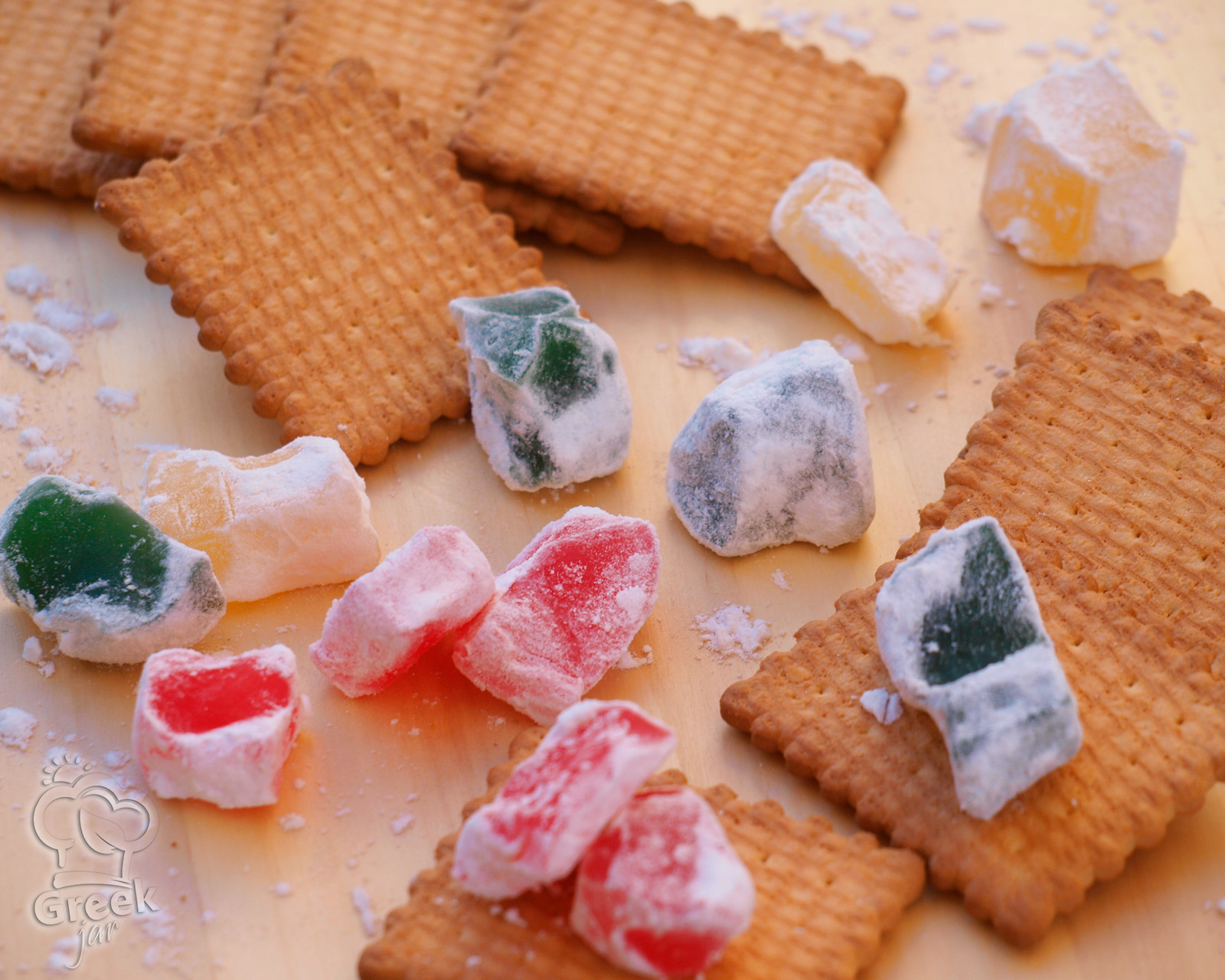 Made with love and simplicity, two petit-beurre cookies gently hold a piece of loukoumi between them, like a little sandwich, pressed softly to unite the crispiness of the cookie with the chewy sweetness of the loukoumi. It’s a “ritual” that brought together young and old around the table, filling the house with the scent of loukoumi: rose, mastic, bergamot...