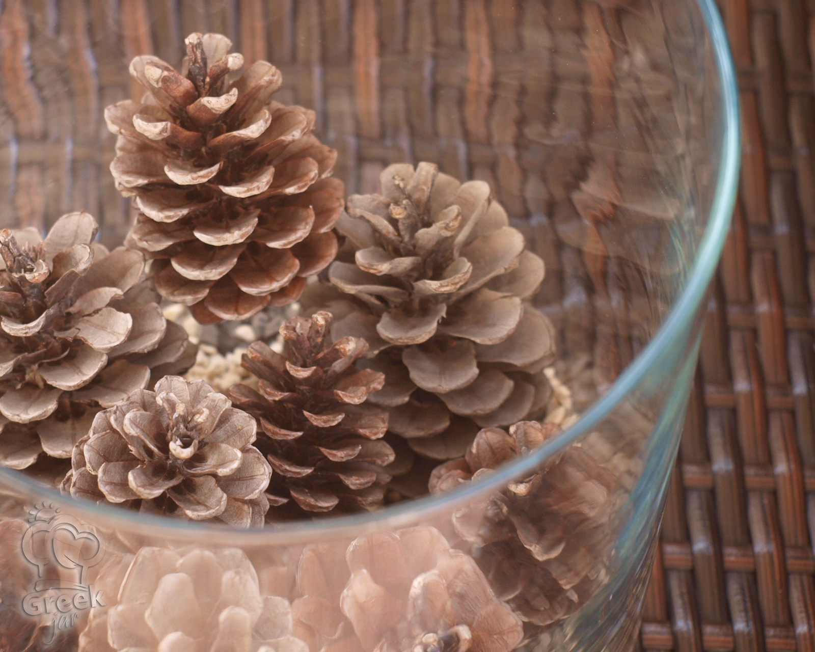 Μία βόλτα στην εξοχή εκτός από την ανανέωση του δικού μας προσωπικού “χώρου”, μπορεί να ανανεώσει και τον χώρο που ζούμε. Αρχικά το μόνο που χρειάζεται είναι να μαζέψουμε μερικά κουκουνάρια, να τα πλύνουμε και να τα αφήσουμε να στεγνώσουν. Σε ένα μπουκάλι με αντλία ψεκασμού βάζουμε ζεστό νερό και μερικές σταγόνες από αιθέριο έλαιο και ψεκάζουμε τα κουκουνάρια. Μπορούμε να προσθέσουμε και μερικές σταγόνες από αιθέριο έλαιο απευθείας πάνω στα κουκουνάρια. Τα τοποθετούμε σε μία διακοσμητική πιατέλα ή σε άλλο διακοσμητικό δοχείο και αρωματίζουμε όμορφα και φυσικά τον χώρο μας.