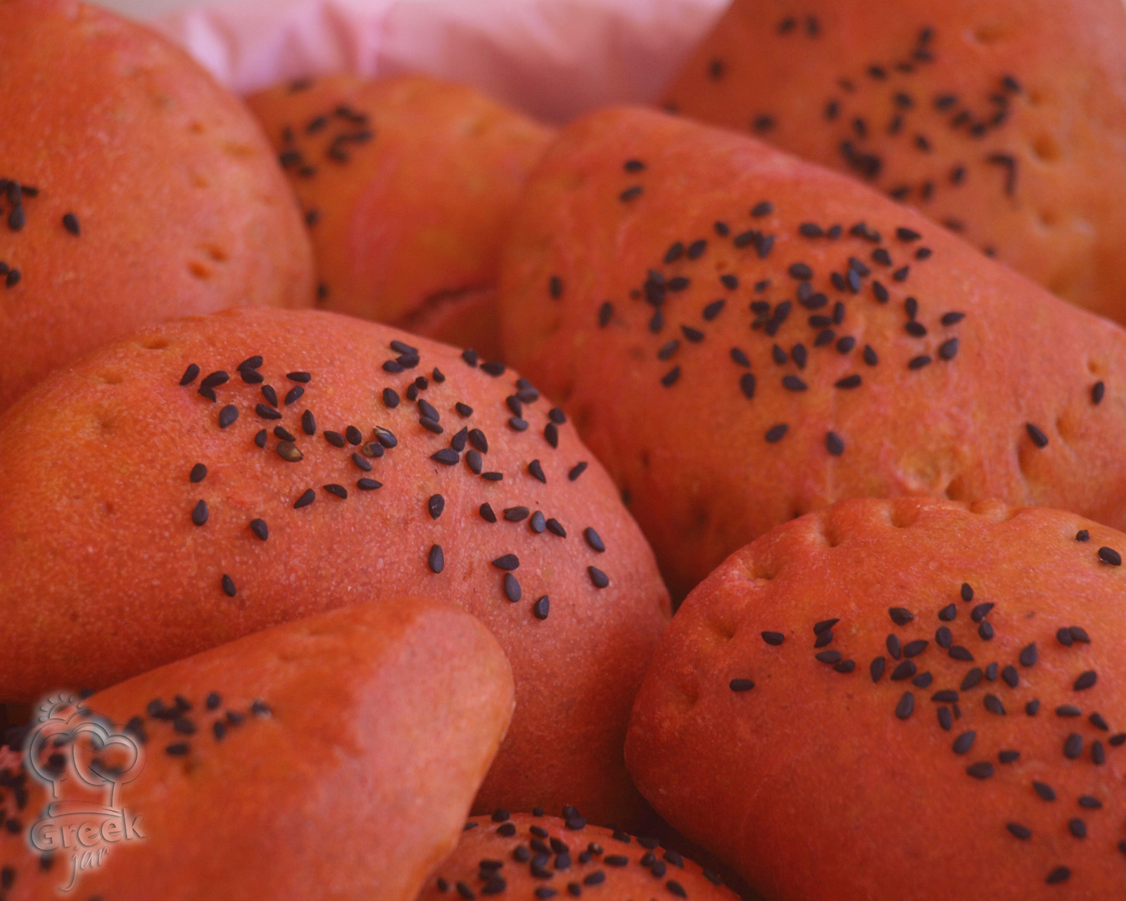 - Αλείφουμε με γάλα, πασπαλίζουμε με μαύρο σουσάμι και ψήνουμε σε προθερμασμένο φούρνο (στον αέρα) στους 150 oC - 300 oF για περίπου 30΄.