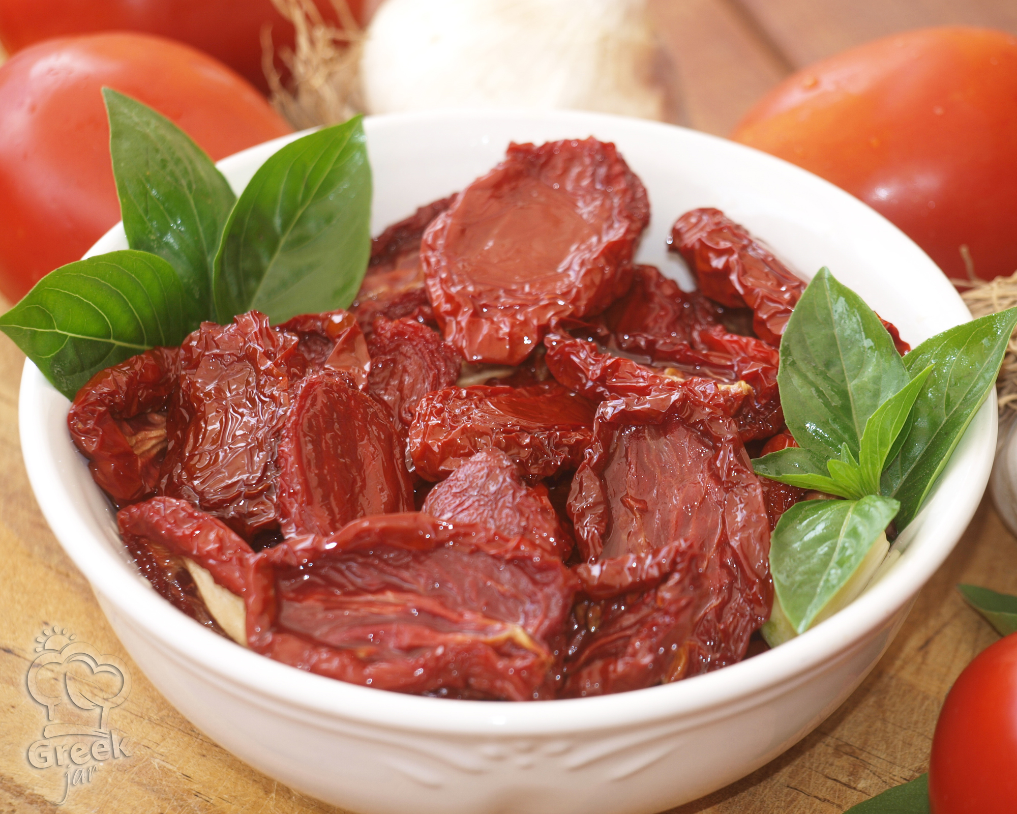 - When they are ready (dried, with no inner moisture but still flexible), put them in a sterilized jar and cover them with olive oil. For a medium jar add 2 tbsp of vinegar, some basil leaves and 3 - 4 cloves of garlic.